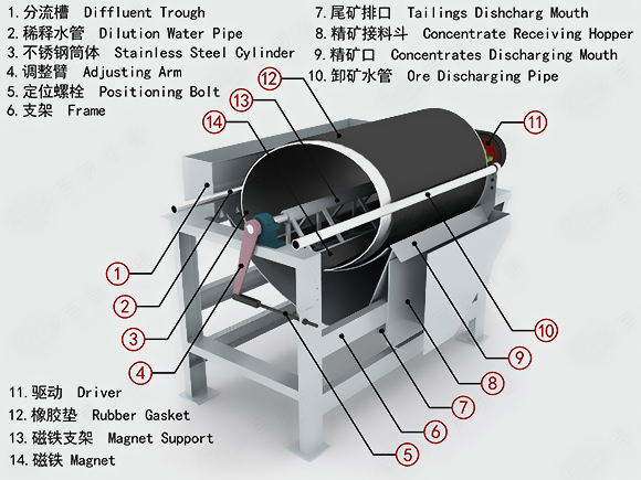 永磁筒式磁選機由磁系、圓筒、分選槽、傳動裝置以及給料、排料各溢流裝置組成。磁系排列和磁極數(shù)量對分選結(jié)果有決定性影響。根據(jù)筒徑大小,磁極一般為4至7極,極性沿周邊方向交替。圓筒用來吸附和運送磁性顆粒并防止礦漿侵入磁系。圓筒及其端蓋用非磁性、高電阻率和耐腐蝕材料制造。分選槽一般用奧氏體不銹鋼制造,用橡膠或合成材料作內(nèi)襯,以防止磨損。一般用齒輪電機或Y系列電機通過減速機驅(qū)動圓筒旋轉(zhuǎn)。