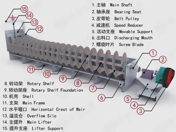 螺旋分級機具體界定為溢流堰位置高于螺旋軸下端的軸承中心,但低于溢流端螺旋的上緣的為高堰式螺旋分級機,它具有一定的沉降區(qū)域,適用于粗粒分級,可以獲得大于0.83至0.15毫米的溢流粒度;溢流堰低于溢流端軸承中心的為低堰式螺旋分級機,它沉降區(qū)面積小,溢流生產(chǎn)能力低,通常不用于分級作業(yè),而用來沖洗礦砂進行脫泥;溢流端的整個螺旋都浸沒在沉降區(qū)的液面下的為沉沒式螺旋分級機,其沉降區(qū)具有較大的面積和深度,適用于細粒分級,可以獲得小于0.15至0.07mm的溢流粒度。